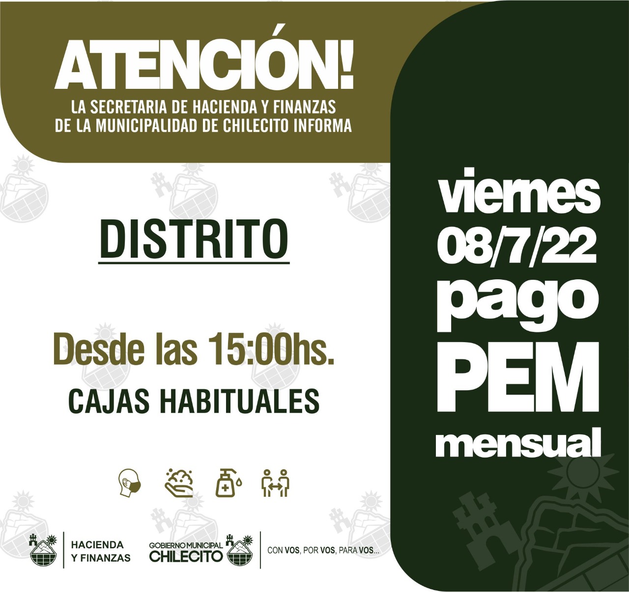 Este viernes 8.07.2022 pagarán PEM MENSUAL a partir de las 15.00 hrs. en las cajas habituales de los DISTRITOS.
