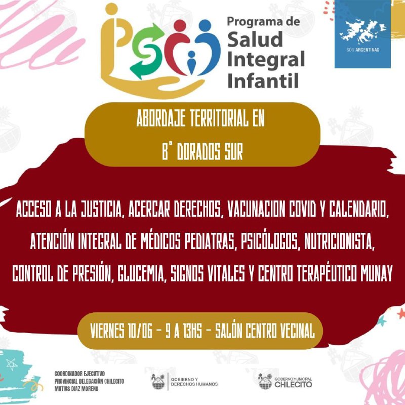 - La Secretaría de Gobierno y Derechos Humanos de la Municipalidad de Chilecito junto a la Coordinación Ejecutiva Provincial Delegación Chilecito organizan un nuevo abordaje Territorial a llevarse a cabo éste Viernes 10/06, a partir de las 9hs en el Salón del Centro Vecinal del B° Dorados Sur.